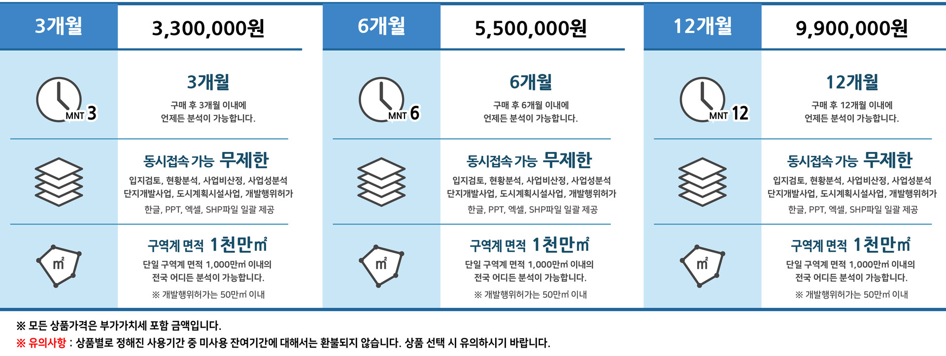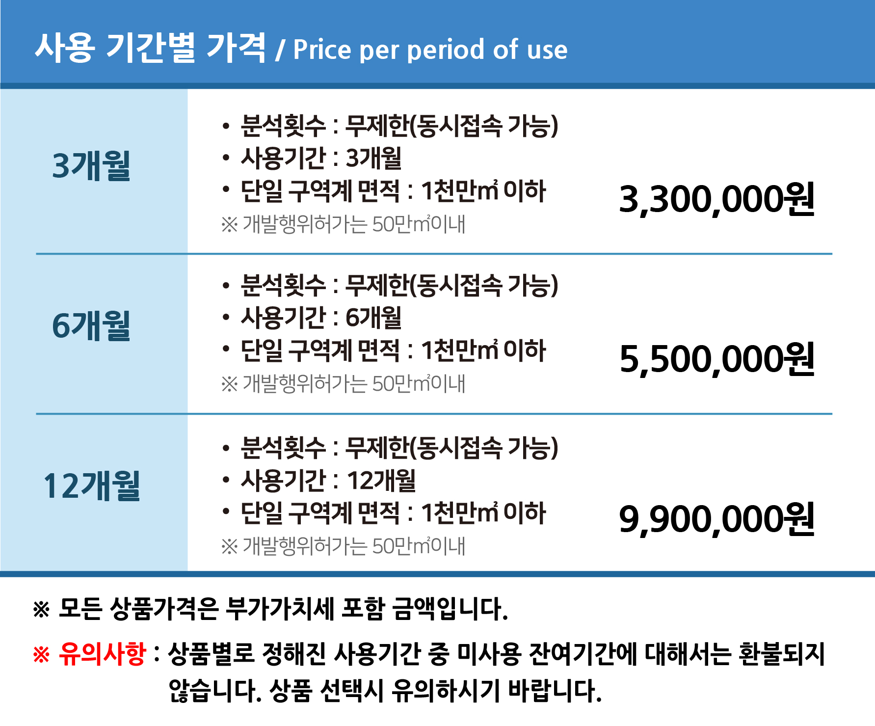 사용기간 내 동시접속 및 무제한 분석 가능한 기간권(3개월, 6개월, 12개월) 요금제를 운영하고 있습니다.